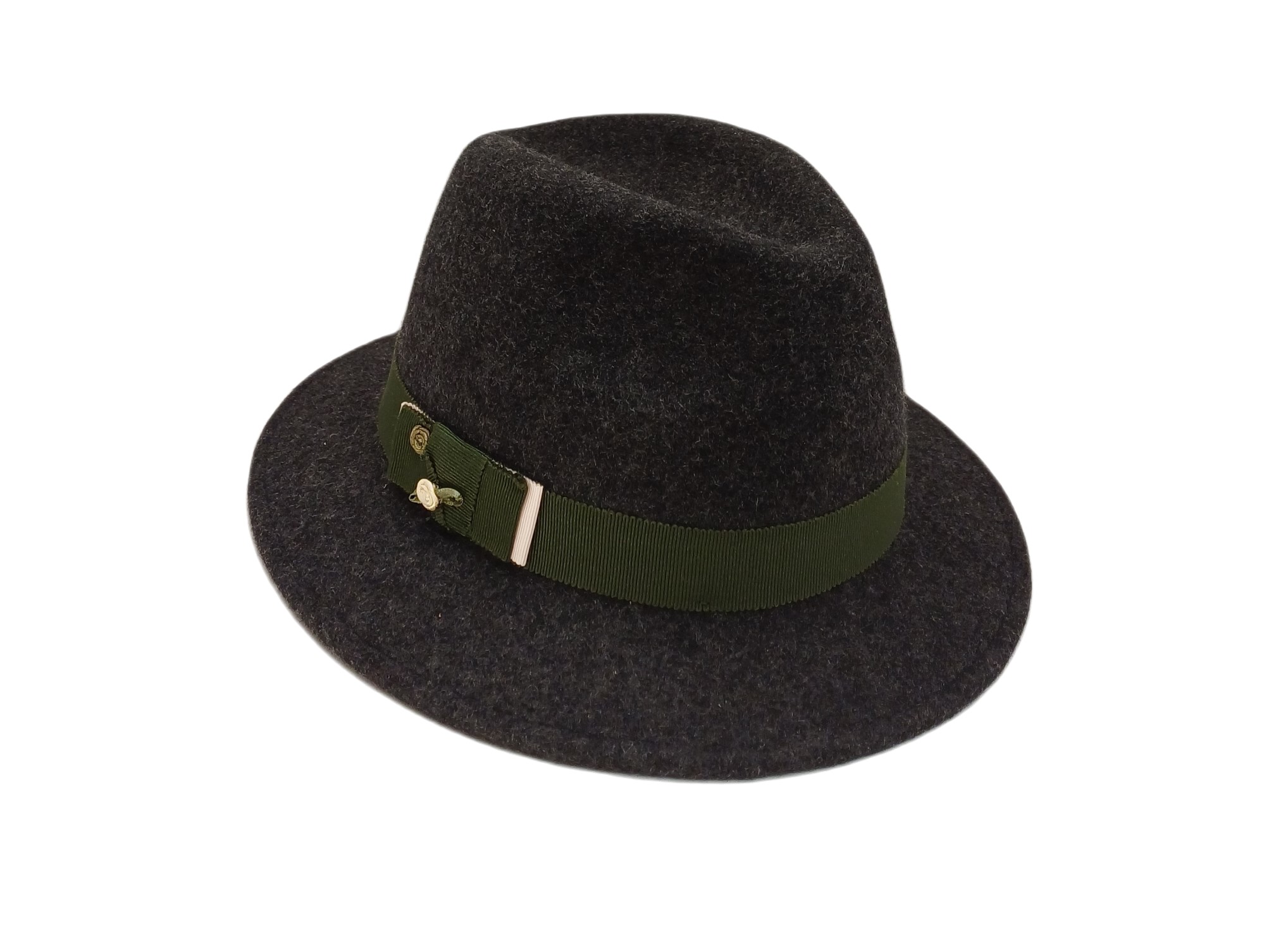 Damenhut in anthrazit mit grünem Ripsband mit kleinen Stoffröschen.
