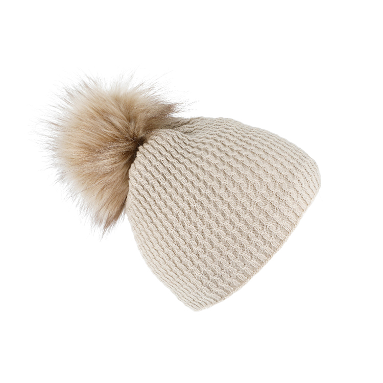 Bommelmütze in beige oder grau mit Glitzerfäden, Kunstfellbommel und Fleccfutter