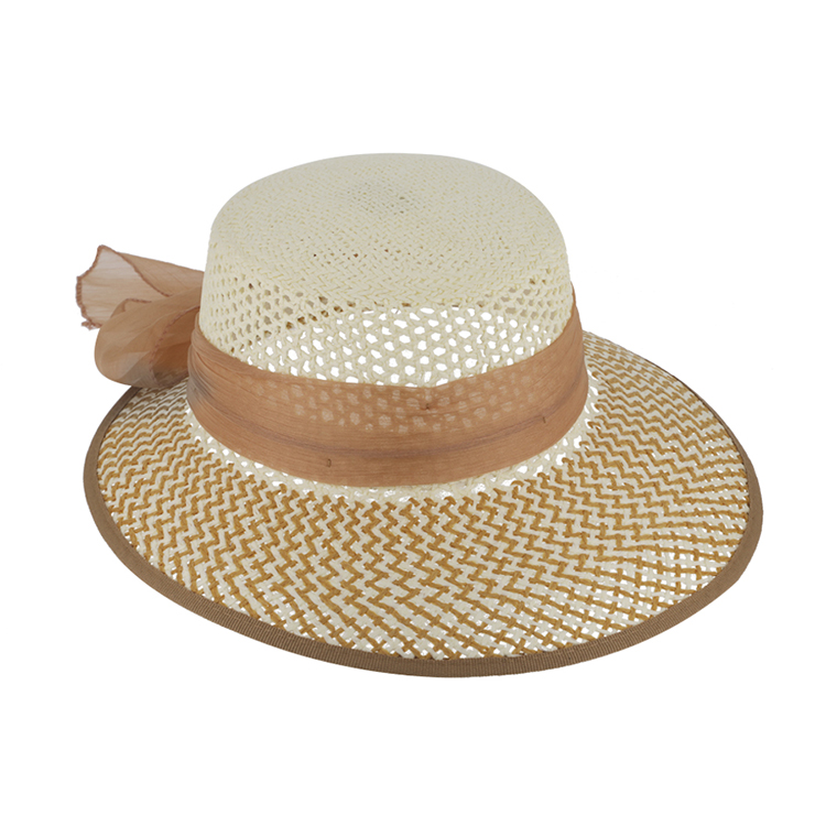 Damenhut in beige und natur gemustert mit Luftlöchern und passendem Seidenband