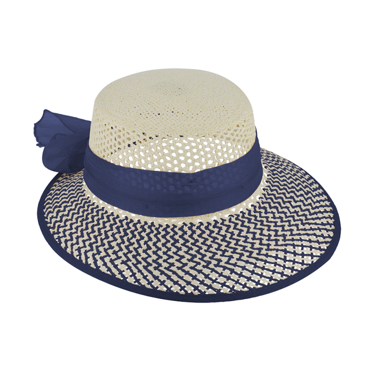 Damenhut in blau und weiß gemustert mit Luftlöchern und passendem Seidenband