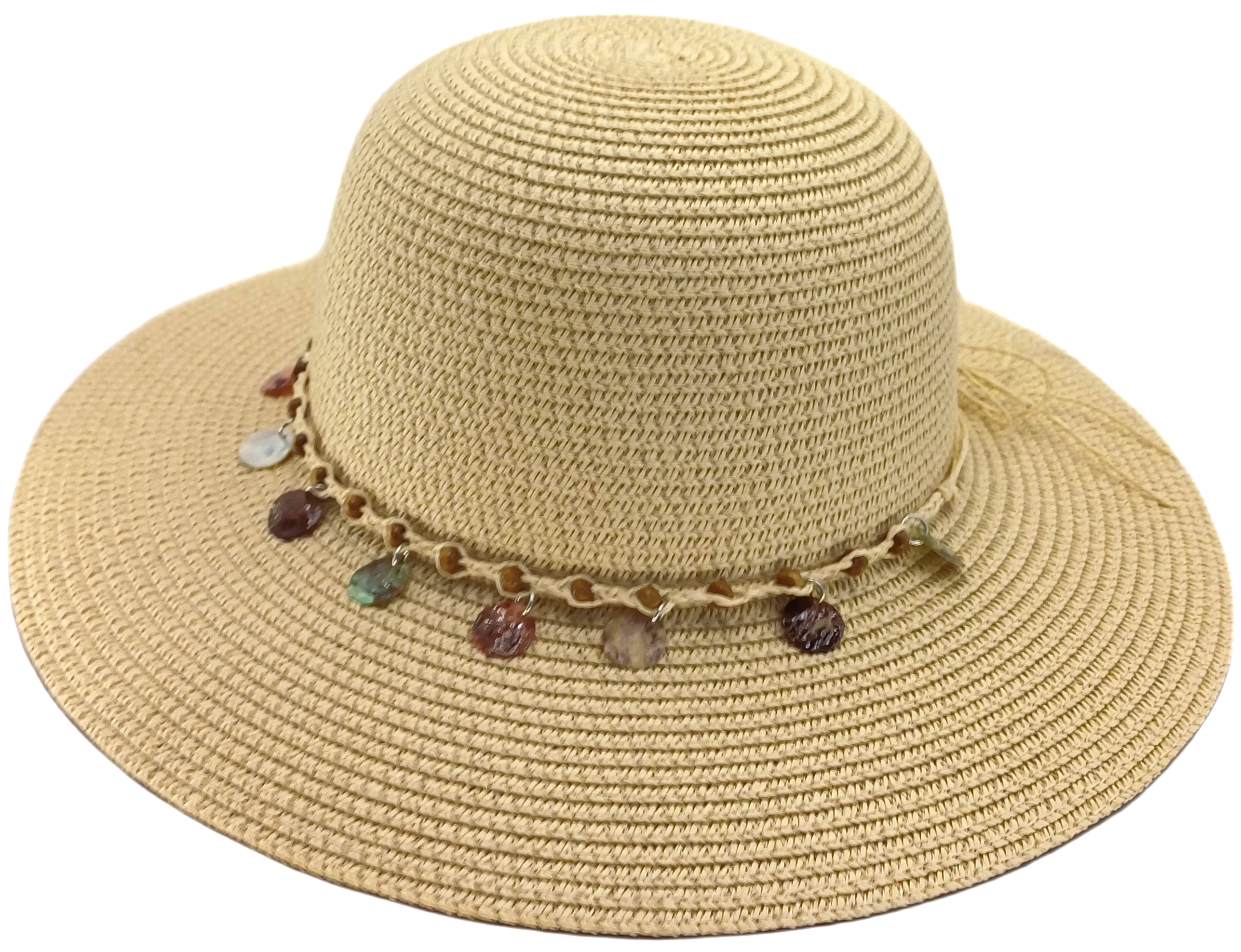 Damenhut in natur mit passendem Band und kleine Steine als Verzierung.
