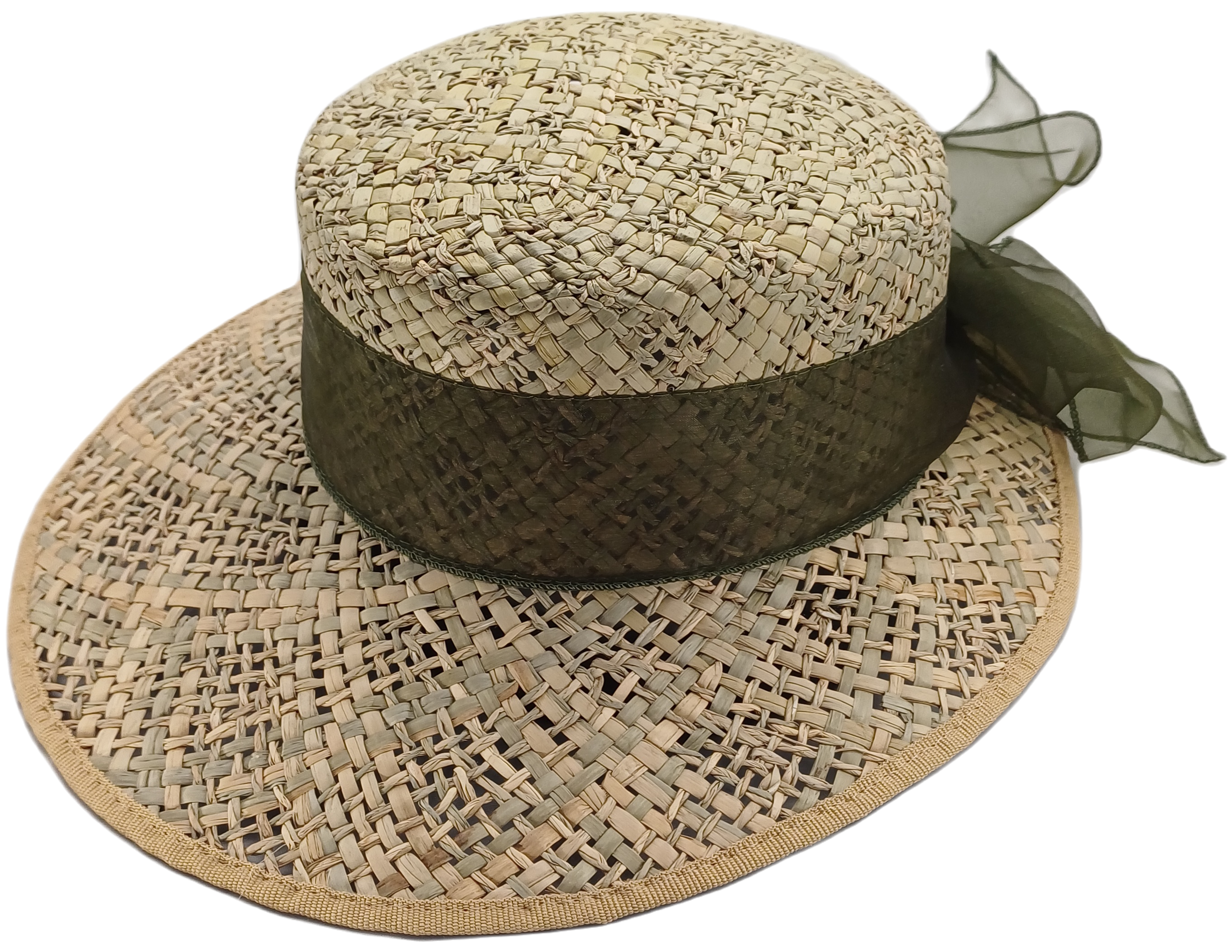 Damenhut aus zweierlei Stroharten geflochten mit olivgrünem Chiffonband