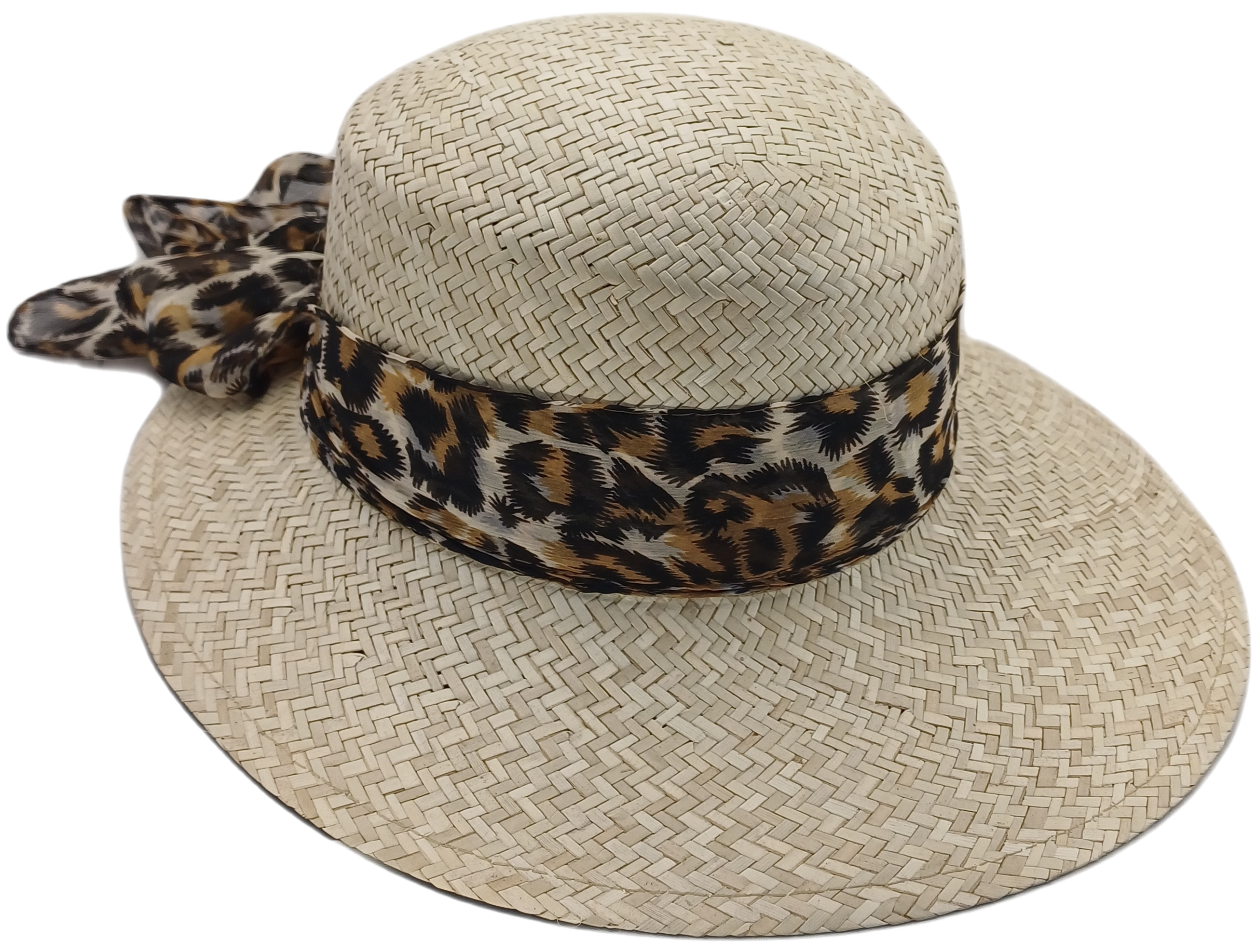Damenhut aus Stroh in natur und Seidenband mit Leopadenmuster.
