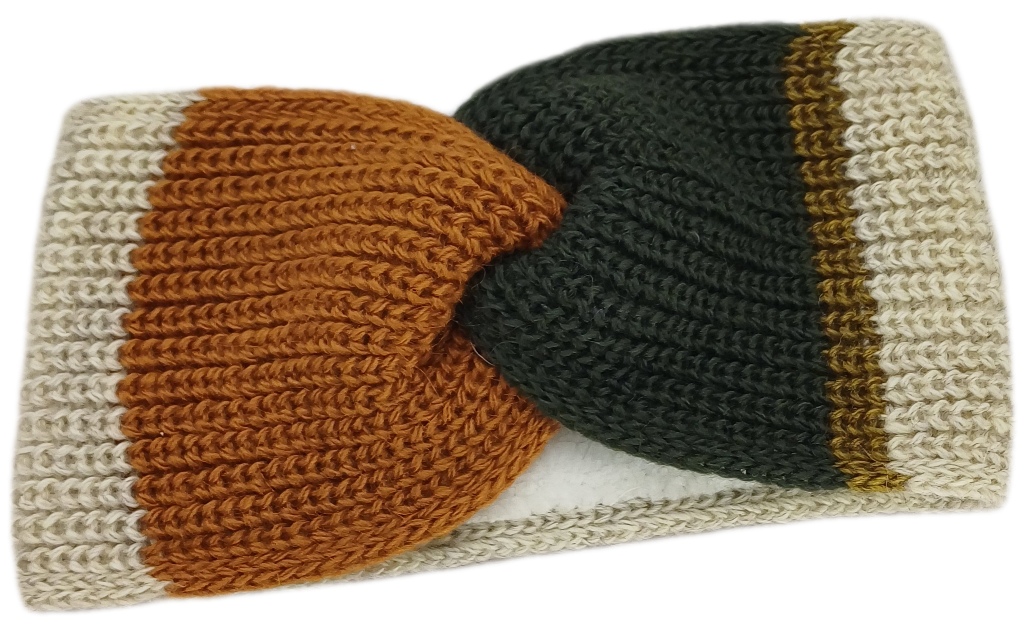 Stirnband in beige, rost und olivgrün mit Fleece ausgefüttert und vorne verschlungen.
