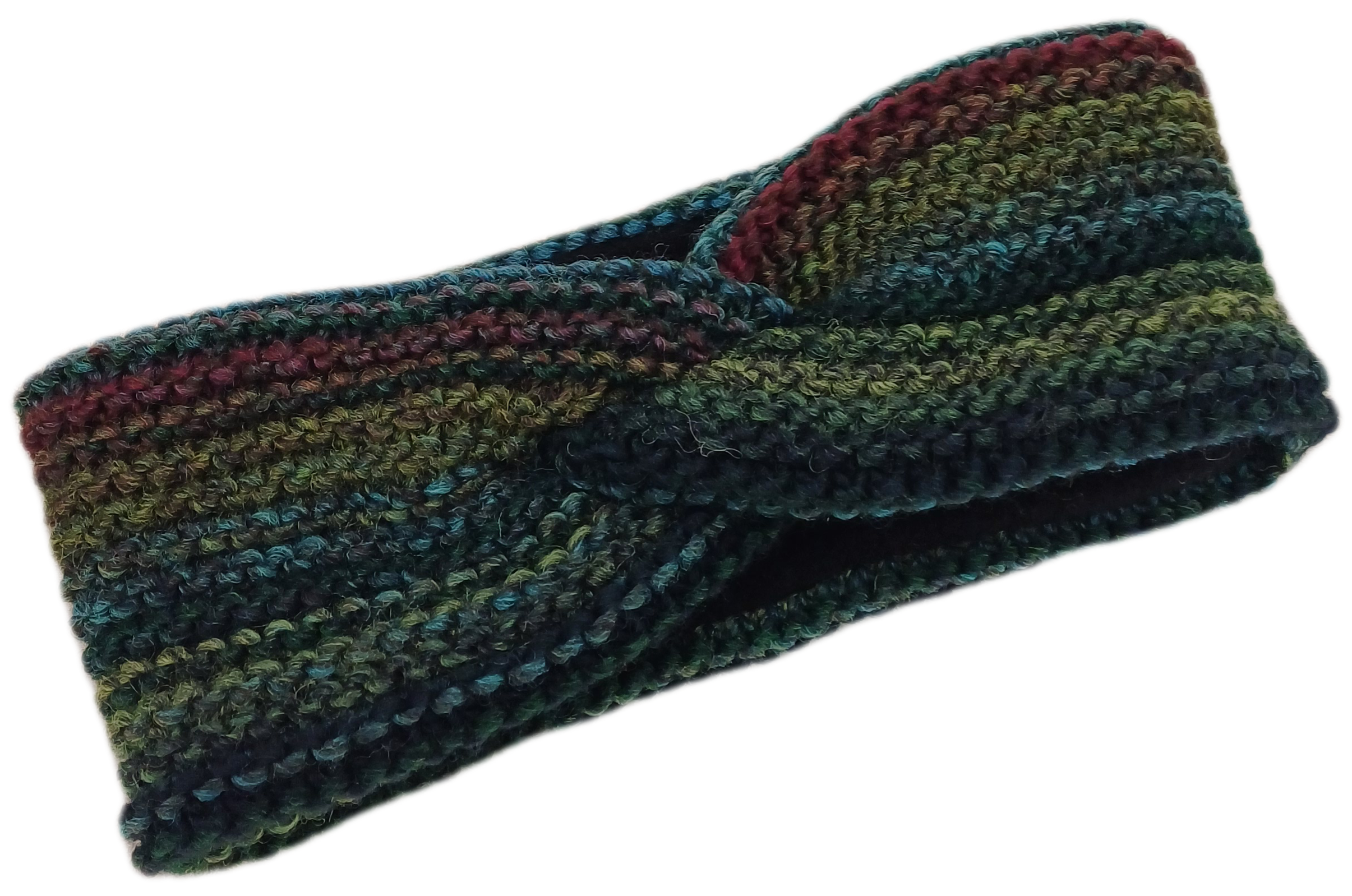 Stirnband mit Strickmuster, vorne zu einem Knoten verschlungen, mit Fleece ausgefüttert.