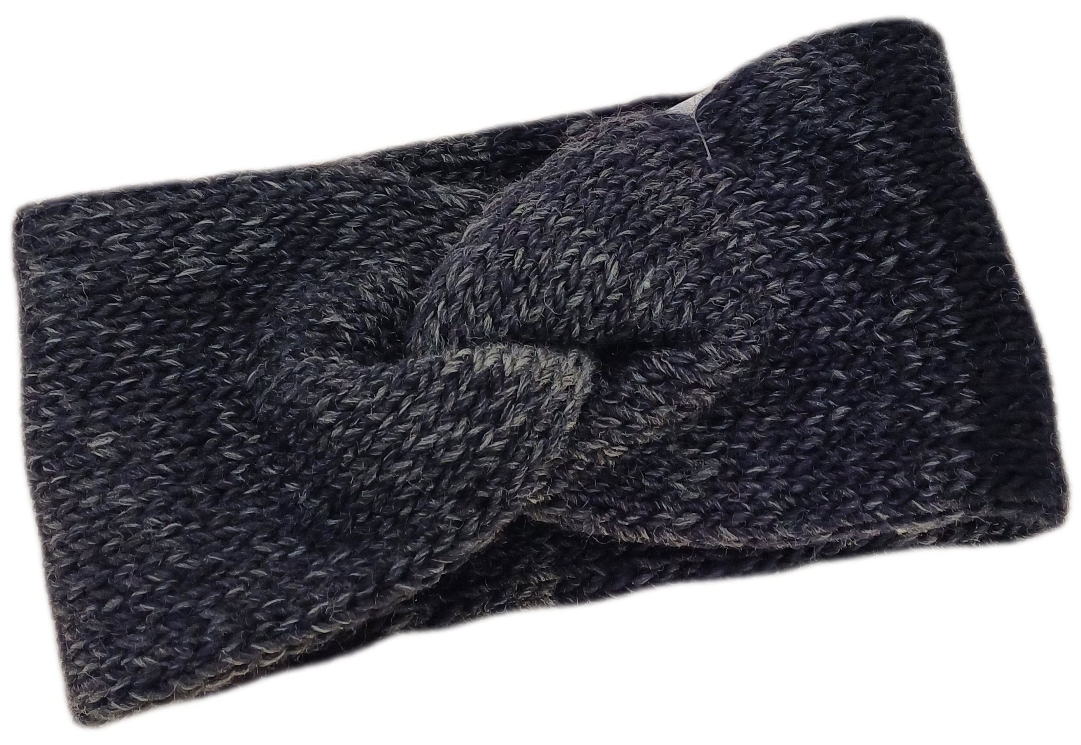 Stirnband, gemustert und vorne zu einem Knoten verschlungen, doppelt gestrickt.