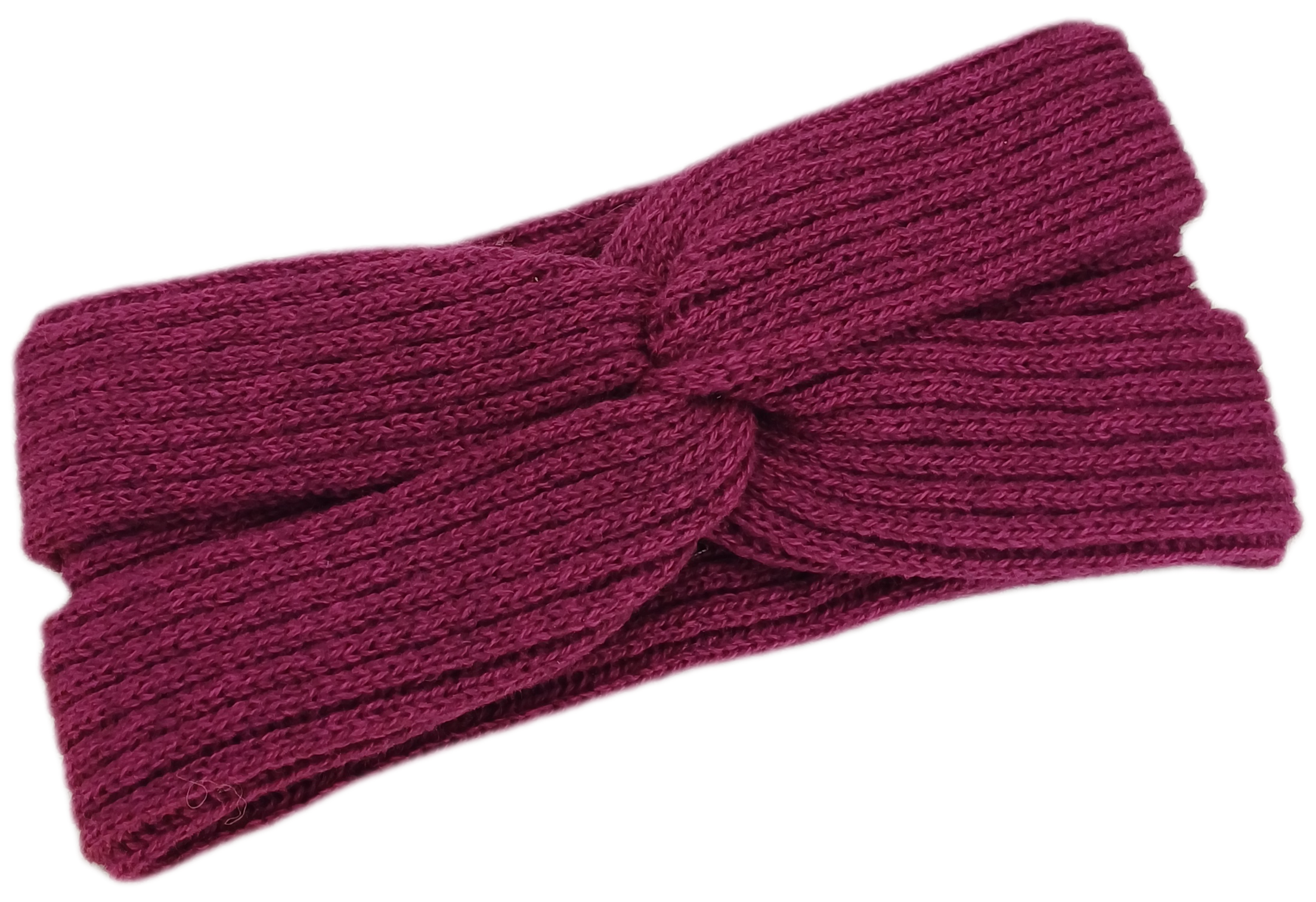 Stirnband in beere, doppelt gestrickt und vorne zu einem Knoten verschlungen.