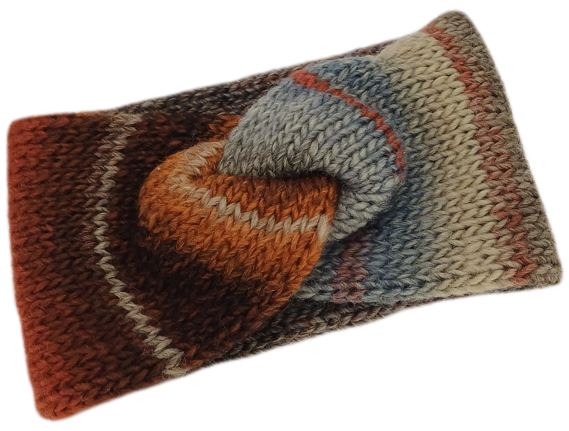 Stirnband, gemustert und vorne zu einem Knoten verschlungen, doppelt gestrickt.