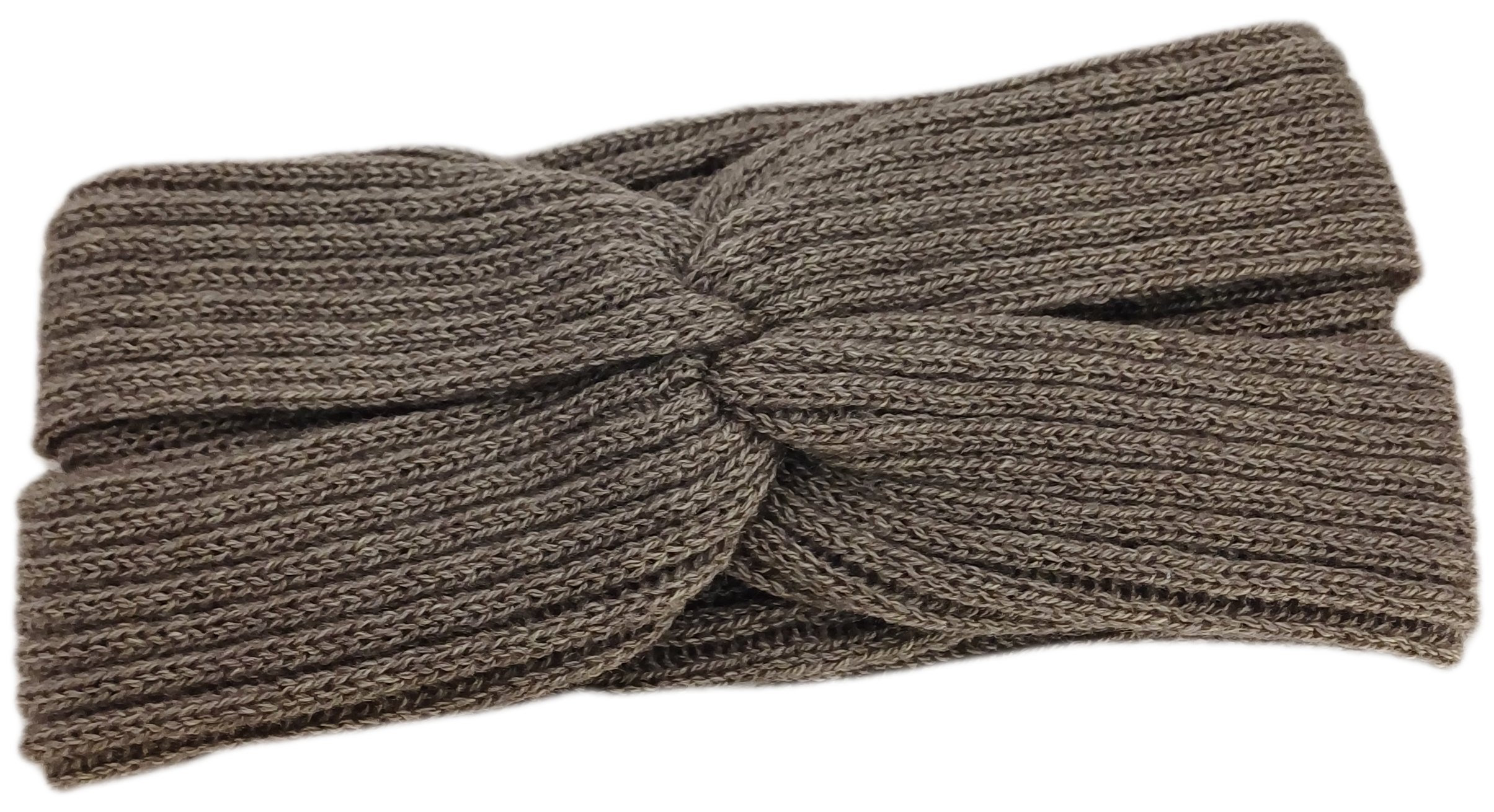 Stirnband in braun, doppelt gestrickt und vorne zu einem Knoten verschlungen.