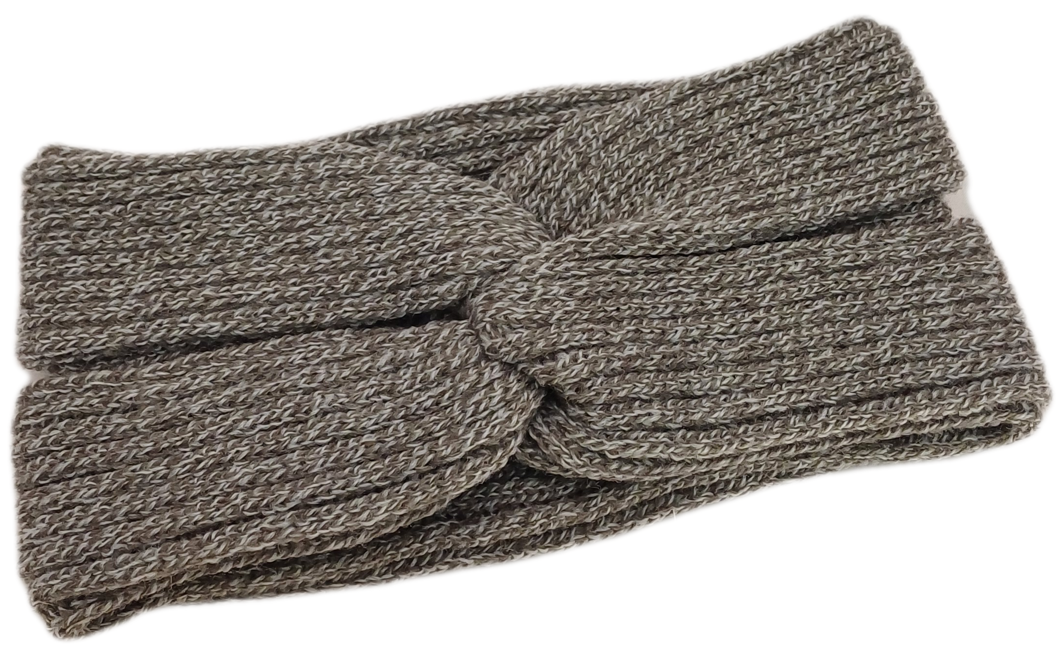 Stirnband in braun meliert, doppelt gestrickt und vorne zu einem Knoten verschlungen.