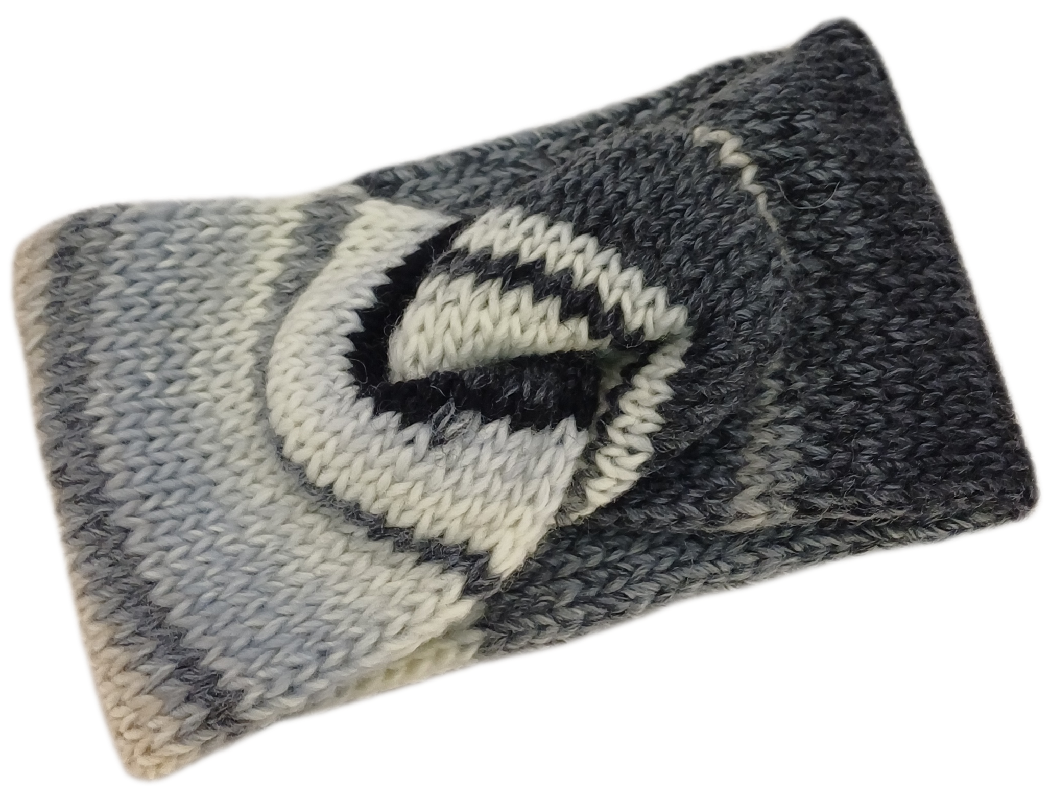 Stirnband, gemustert und vorne zu einem Knoten verschlungen, doppelt gestrickt.