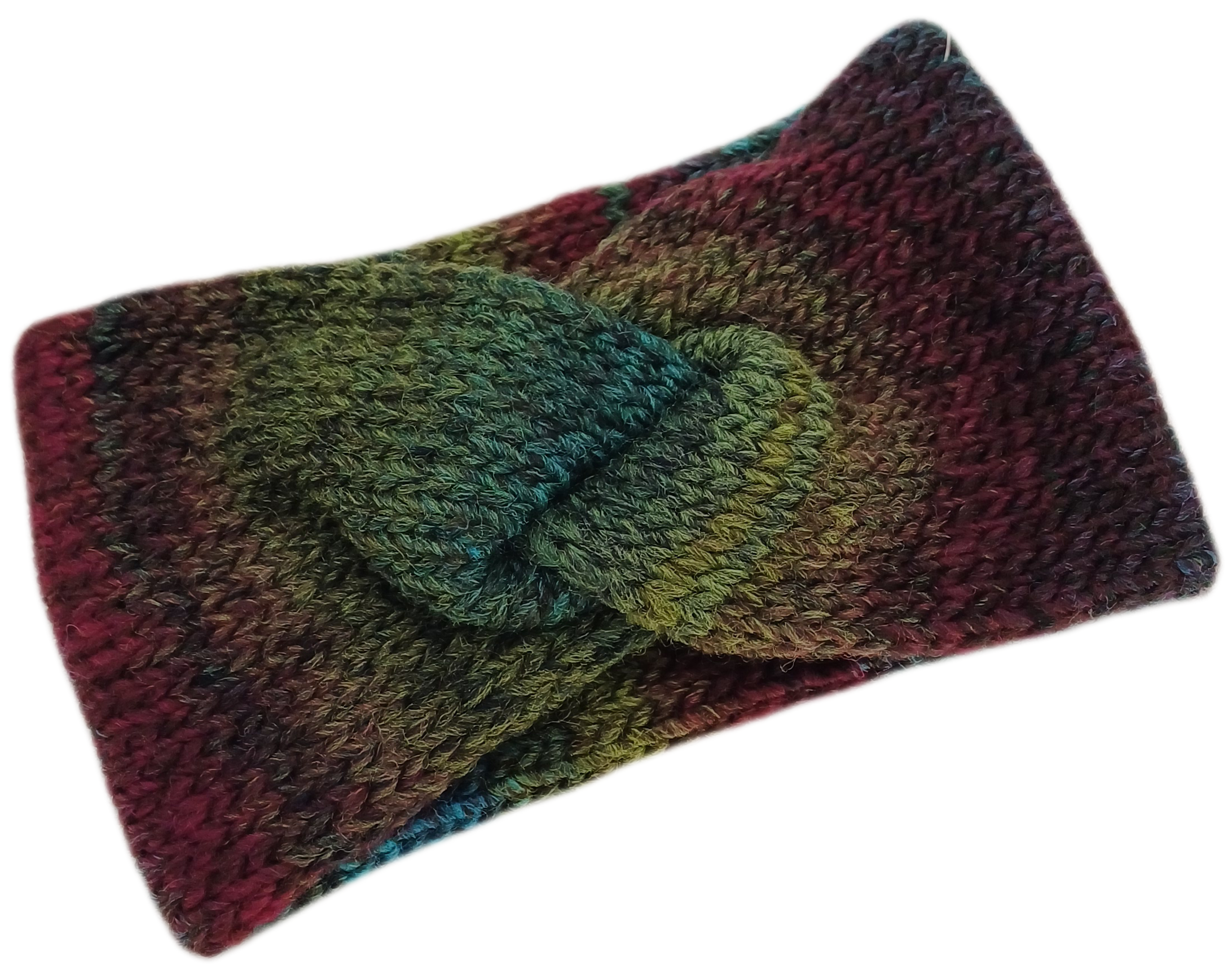 Stirnband in grün und Weinrot meliert, doppelt gestrickt und vorne zu einem Knoten verschlungen