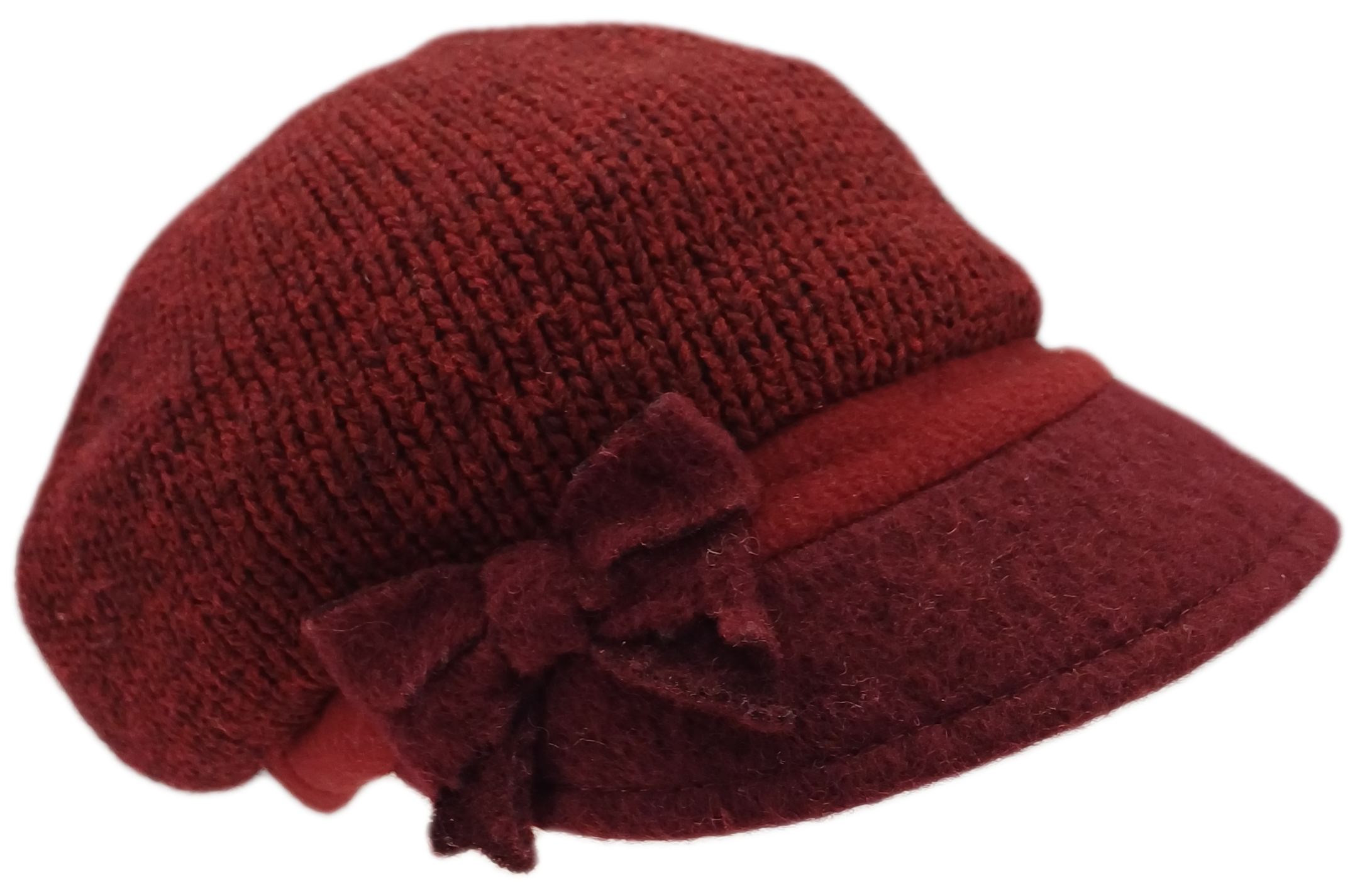 Gestrickte Ballonmütze mit farblich passendem Schirm.
