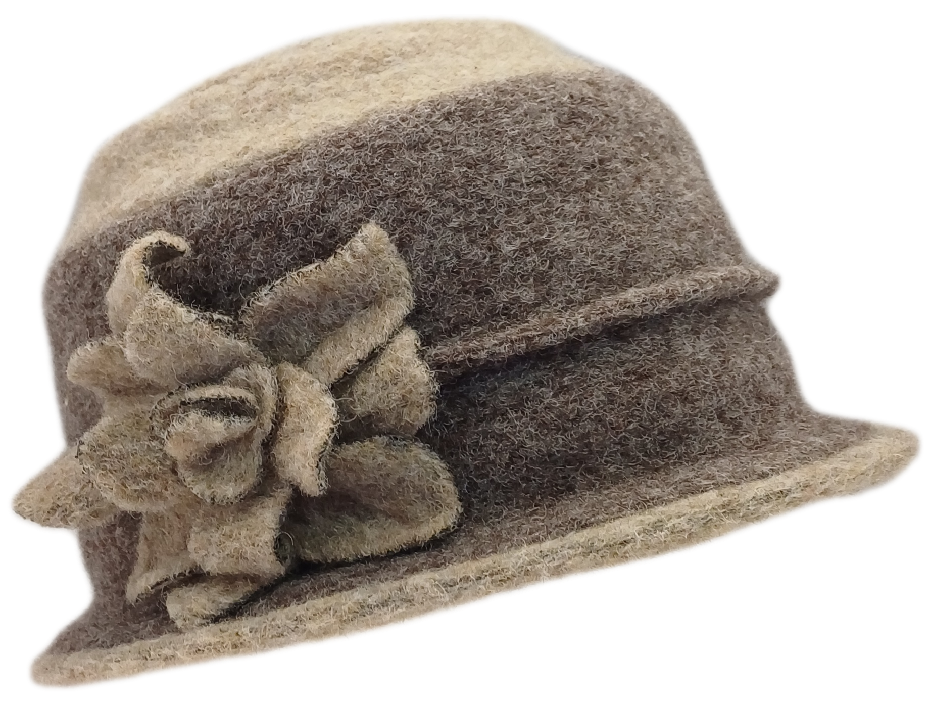 Walkmütze in beige mit Blumengarnitur und Fleecefutter.
