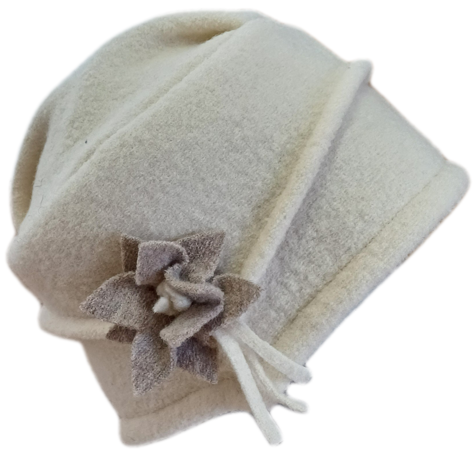 Walkmütze in natur mit Blumengarnitur.