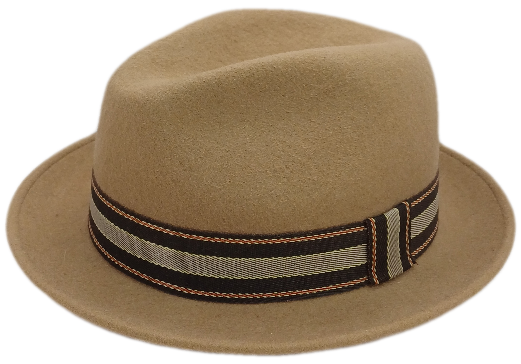 Herrenhut in kamel mit braun-gestreiftem Band.