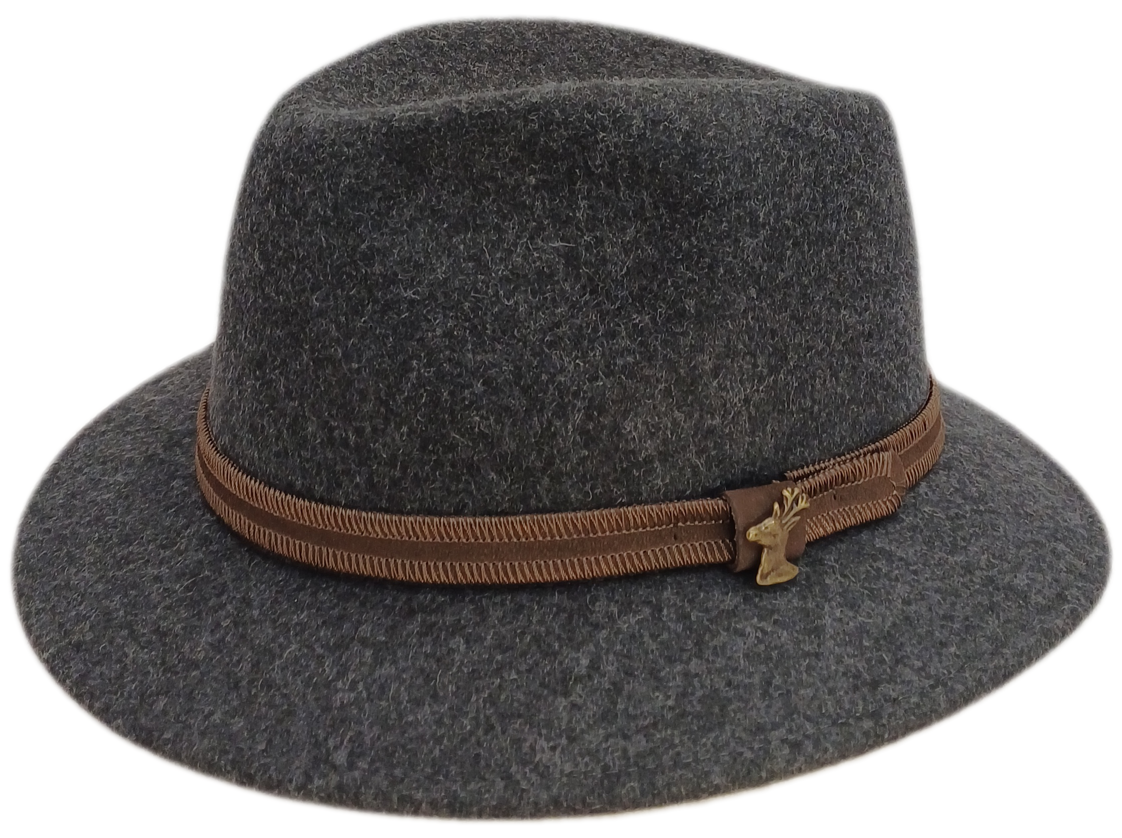 Herrenhut in anthrazit mit braunem Kunstlederband und einem Hirschabzeichen.