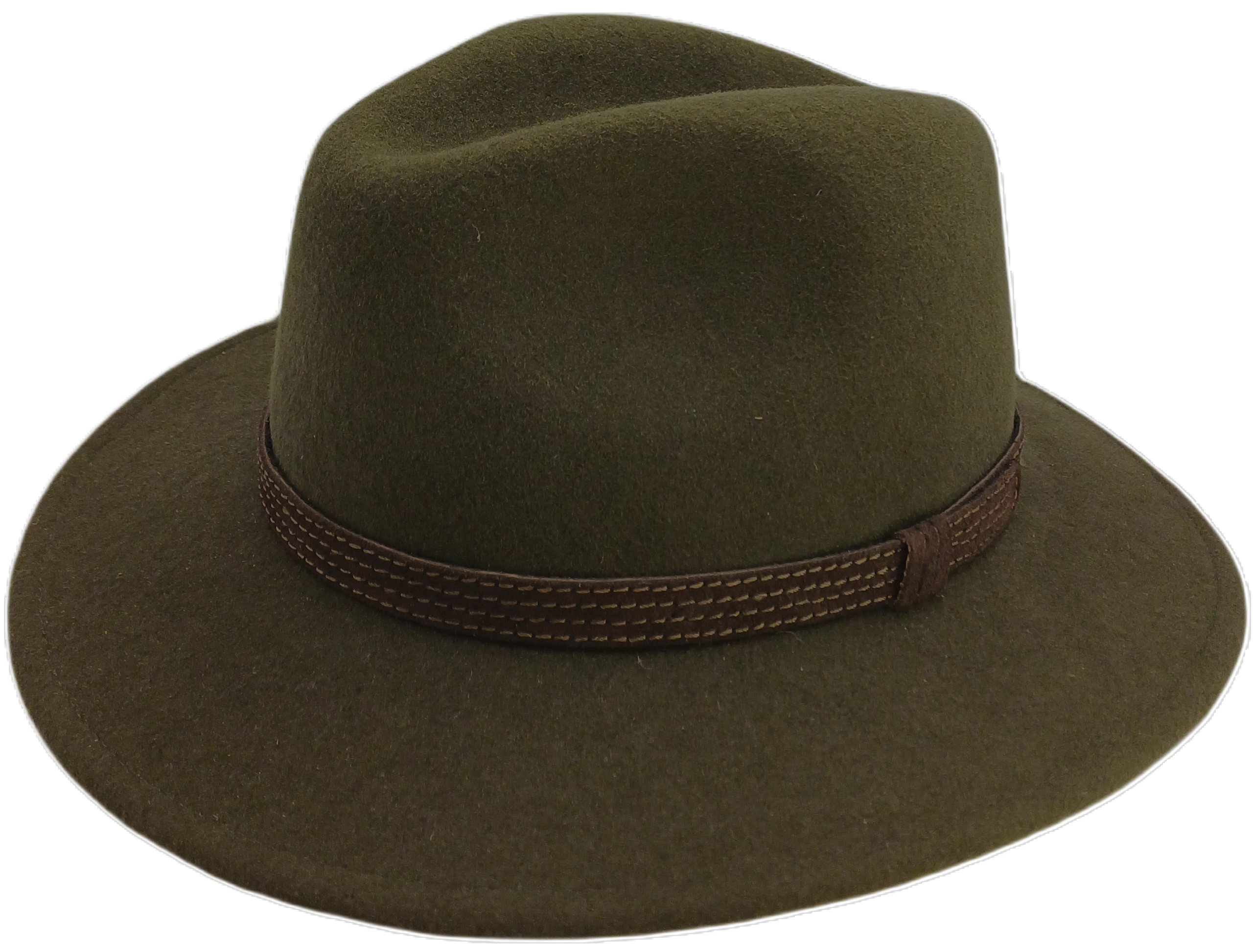 Herrenhut in oliv mit braunem Kunstlederband und Metallschnalle.