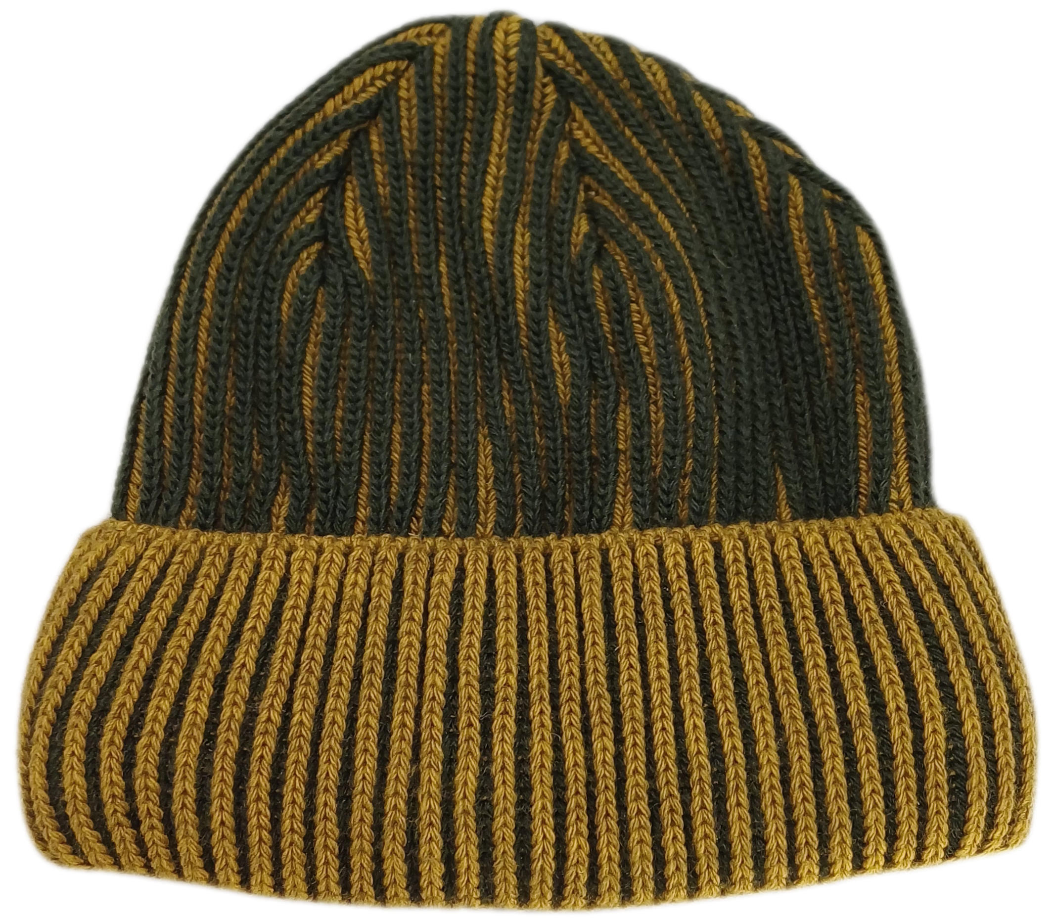 Herrenmütze in dunkelgrün und senfgelb gestreift , mit Fleece ausgefüttert.