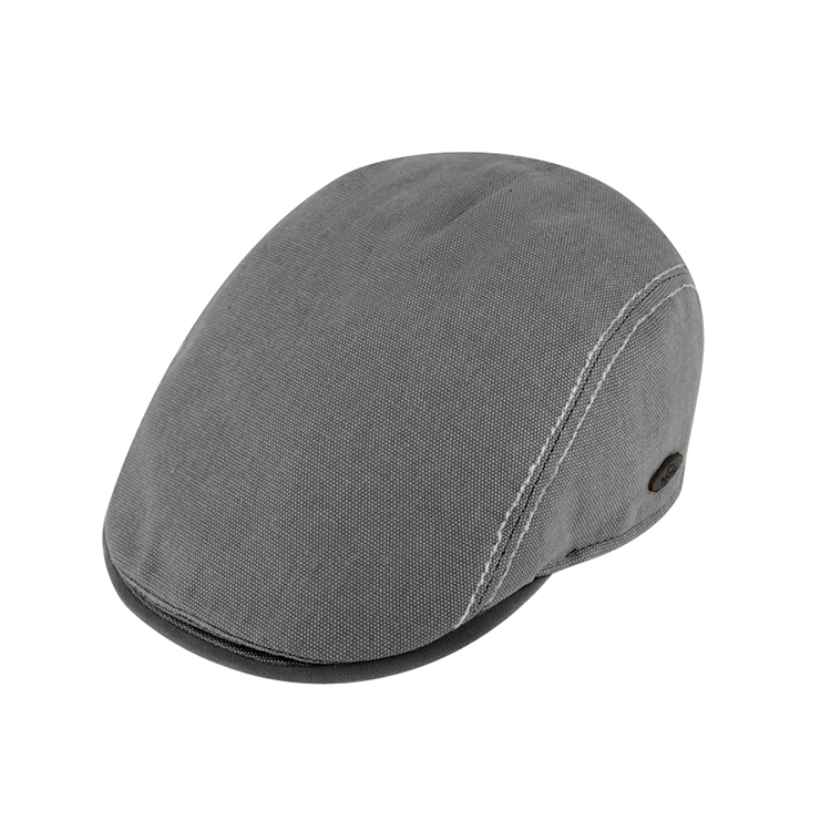Schiebermütze aus grauem Baumwollstoff, mit farblich abgesetztem Schirm und farblich passenden Kontrastnähten.
