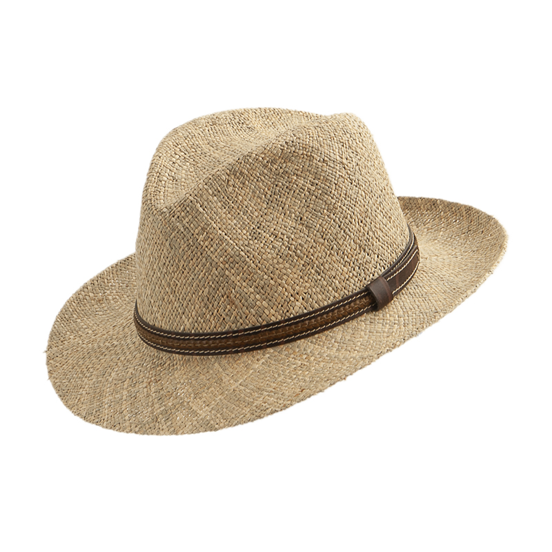 Sportlicher Strohhut aus Seegras in natur mit braunem Kunstlederband.