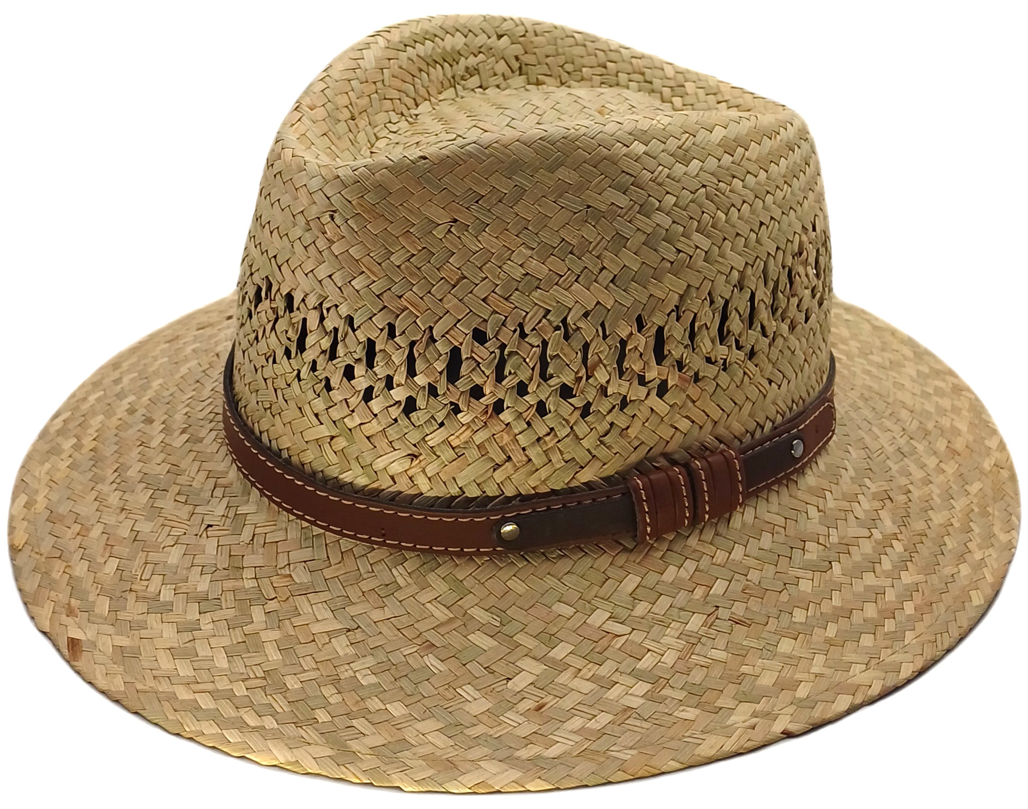 Strohhut in natur mit Luftlöchern und braunem Kunstlederband Kunstlederband mit Stoffband als Kontrast.