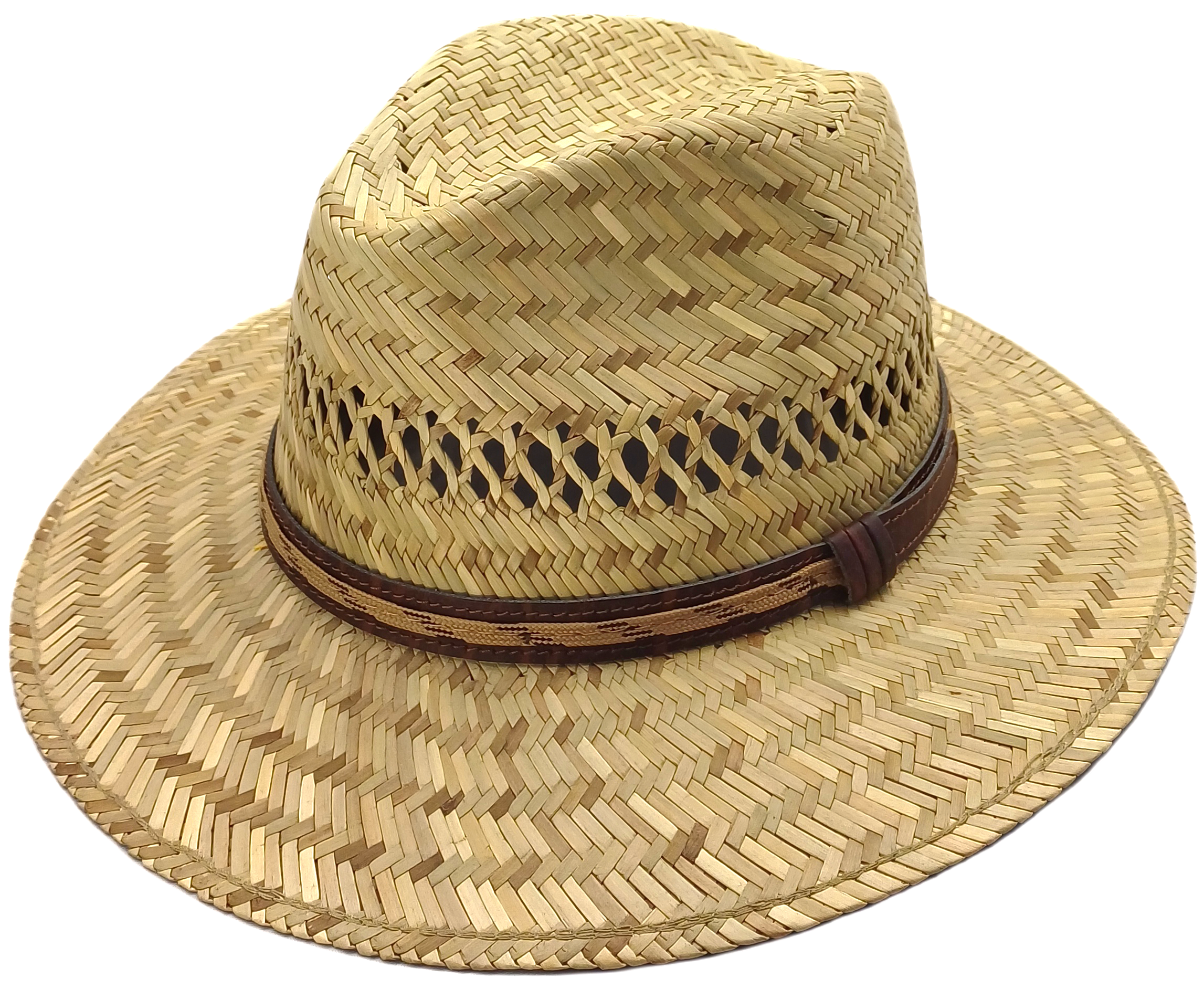 Strohhut in natur mit Luftlöchern und braunem Kunstlederband mit Stoffband als Kontrast.