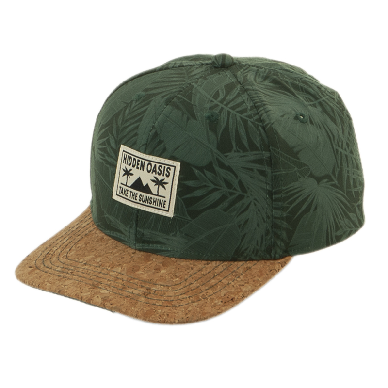 Kinderkappe in grün mit Blätterprint und Korkschild.