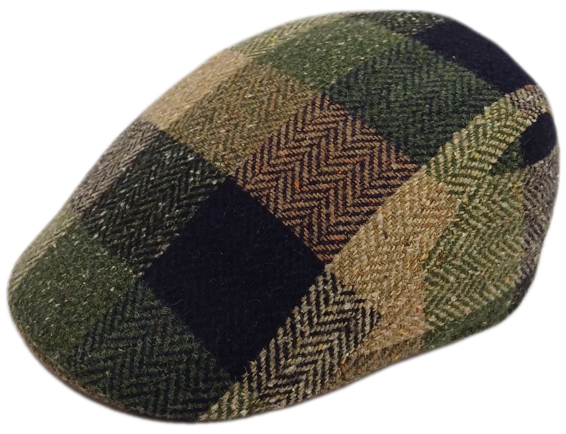 Schiebermütze mit Patchworkmuster in braun, grün, blau.