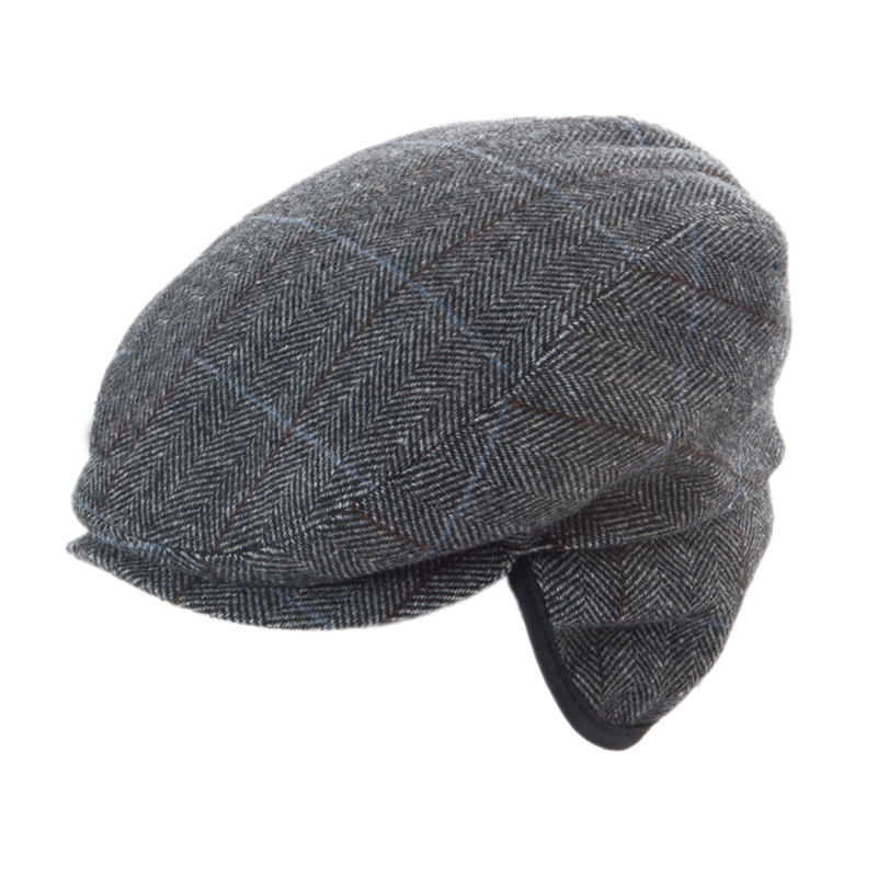 Schiebermütze in grau meliert mit Fischgratmuster und ausklappbare Ohrenklappen.